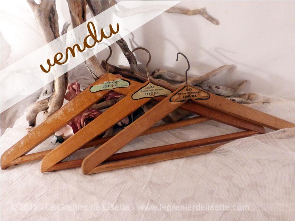 Trio de cintres anciens pour pantalon. Une étiquette sur le devant : 20 porte vêtement IDEAL, et une étiquette au dos . Certaines étiquettes sont abimées, mais c’est ce qui rend ces cintres vintages et authentiques !