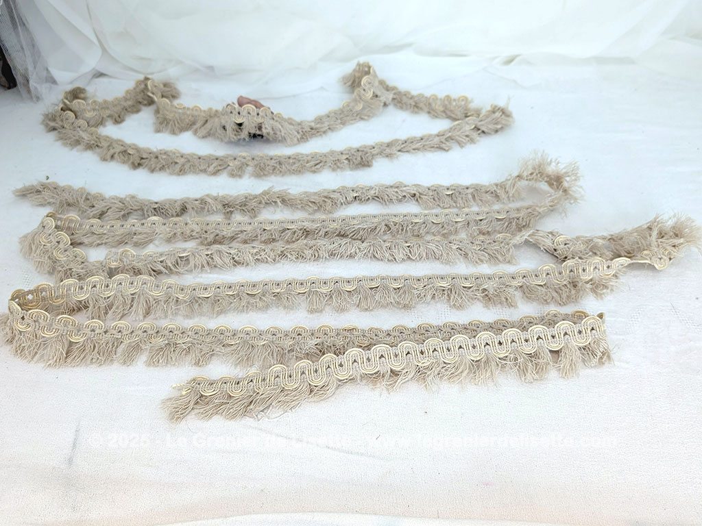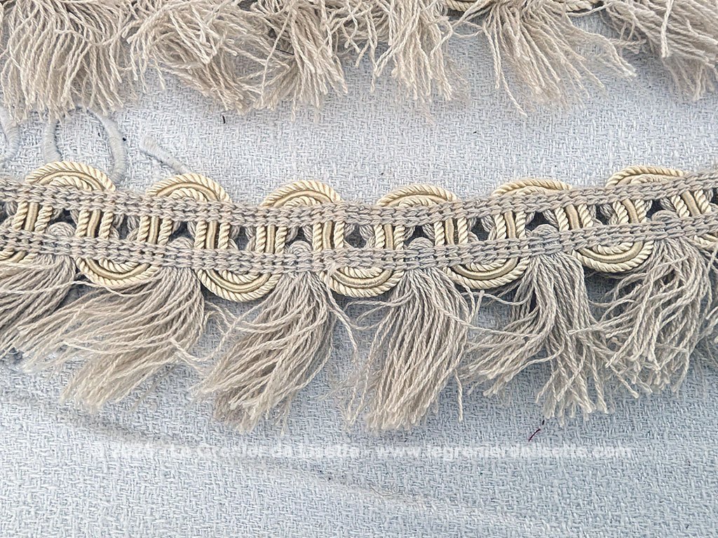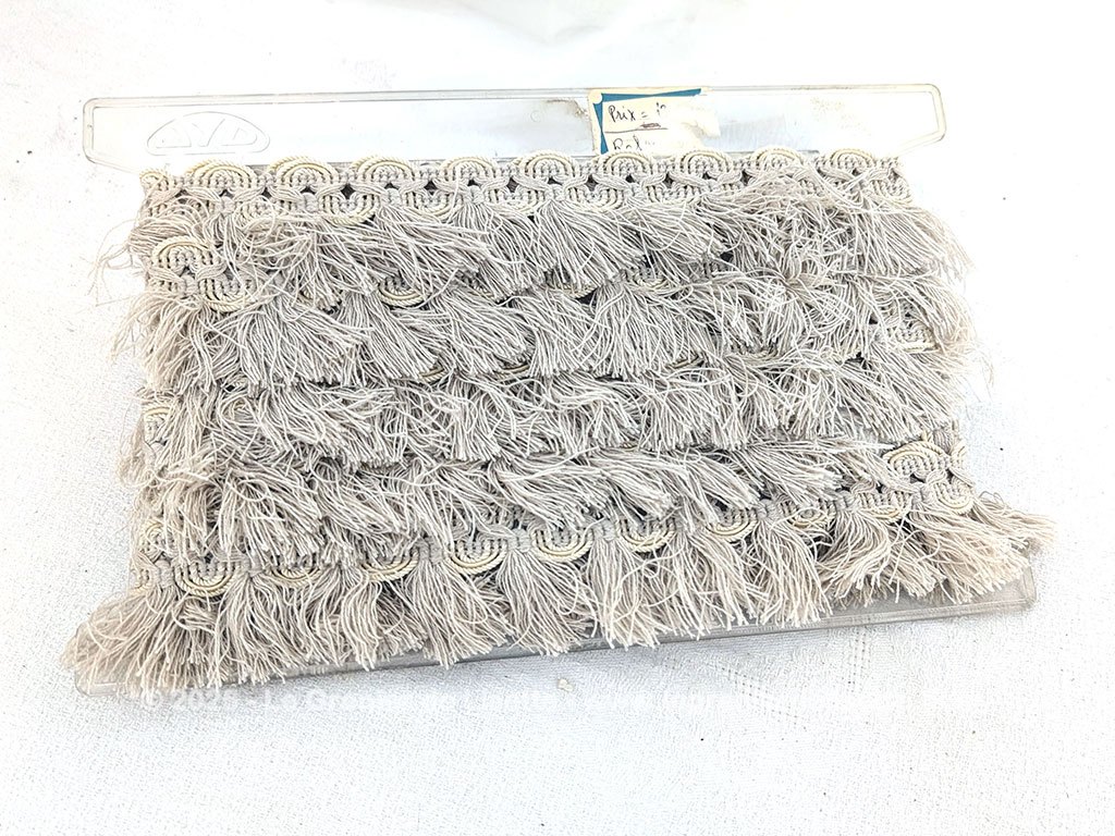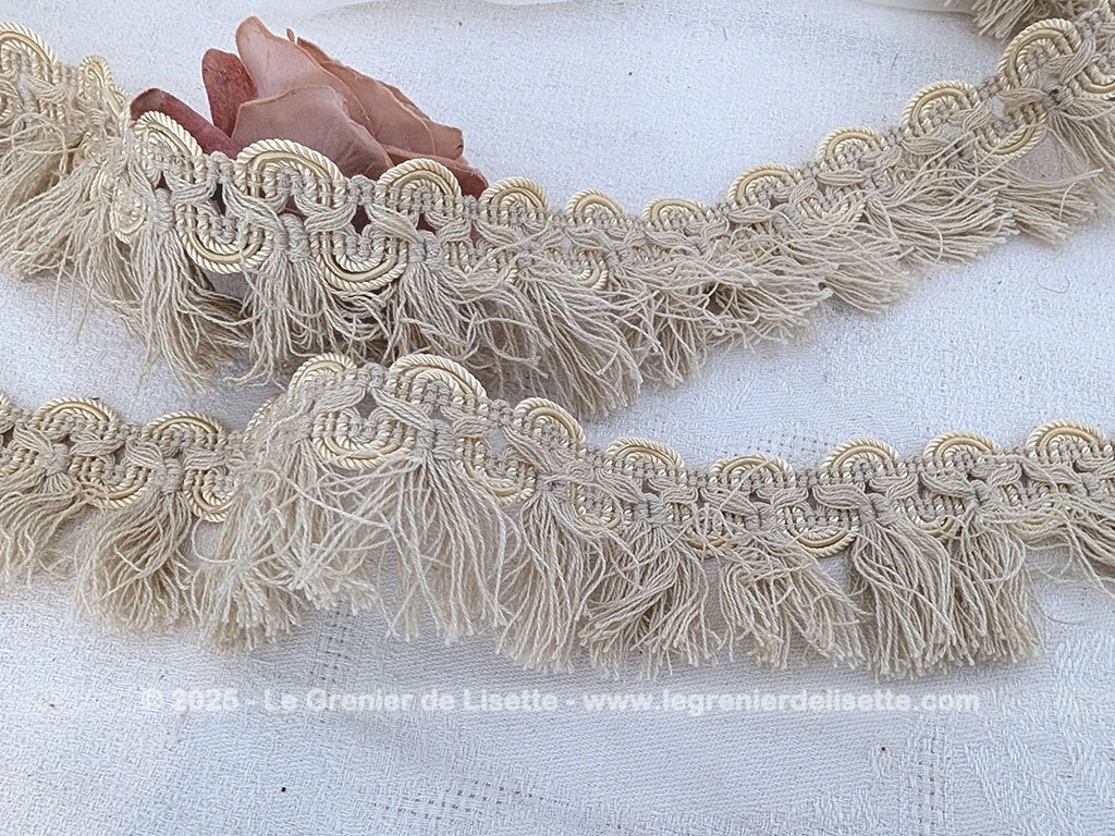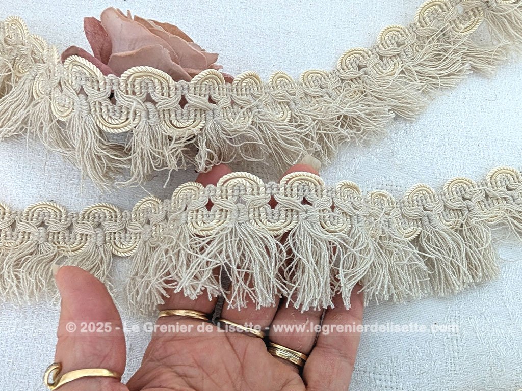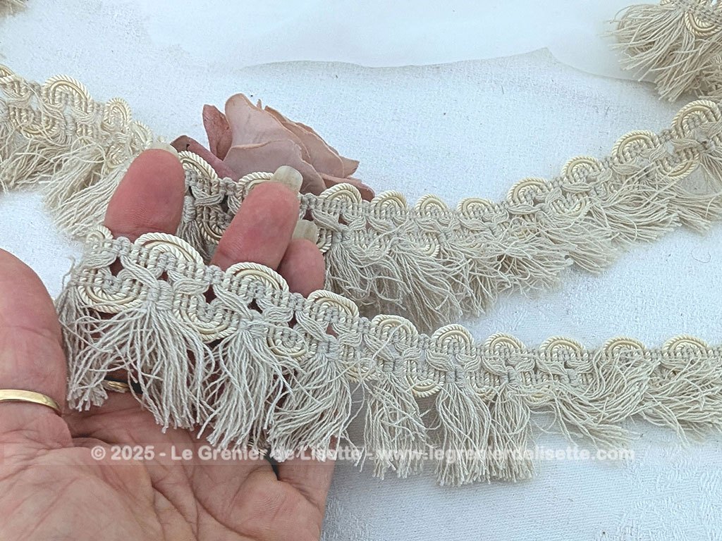 Sorti tout droit d’une ancienne mercerie, voici un trio de longs coupons de galon écru frangé sur 2 cm de galon et 3 cm de franges en 75 + 105+ 385 cm.